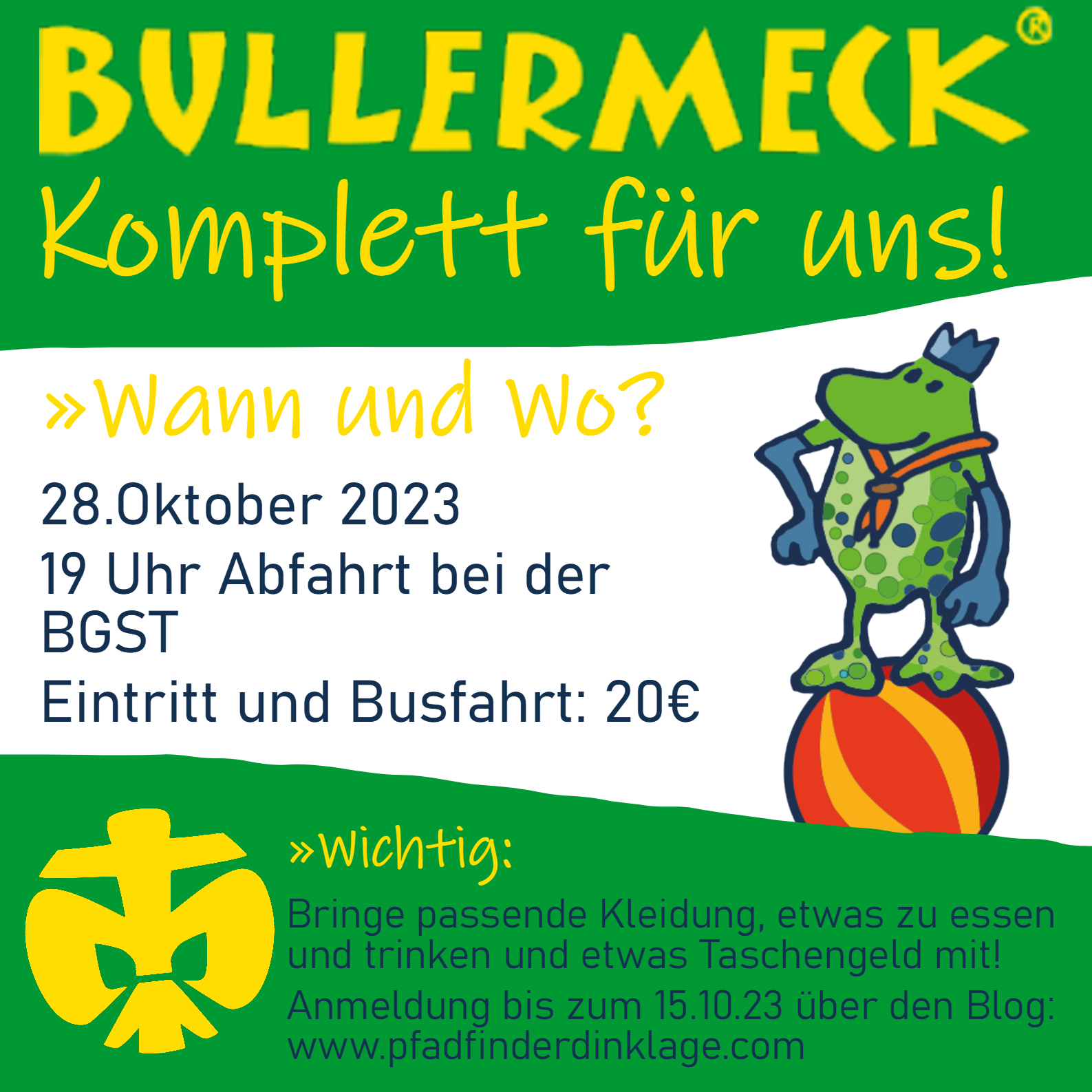 Wir treffen uns am 28.10.2023 um 19:00 Uhr bei der Begegnungsstätte und fahren gemeinsam mit dem Bus nach Rieste. Der Teilnahmebeitrag von 20€ beinhaltet die Busfahrt, sowie den Eintritt und wird im Bus eingesammelt. Gegen 22:45 kommen wir wieder in Dinklage an.